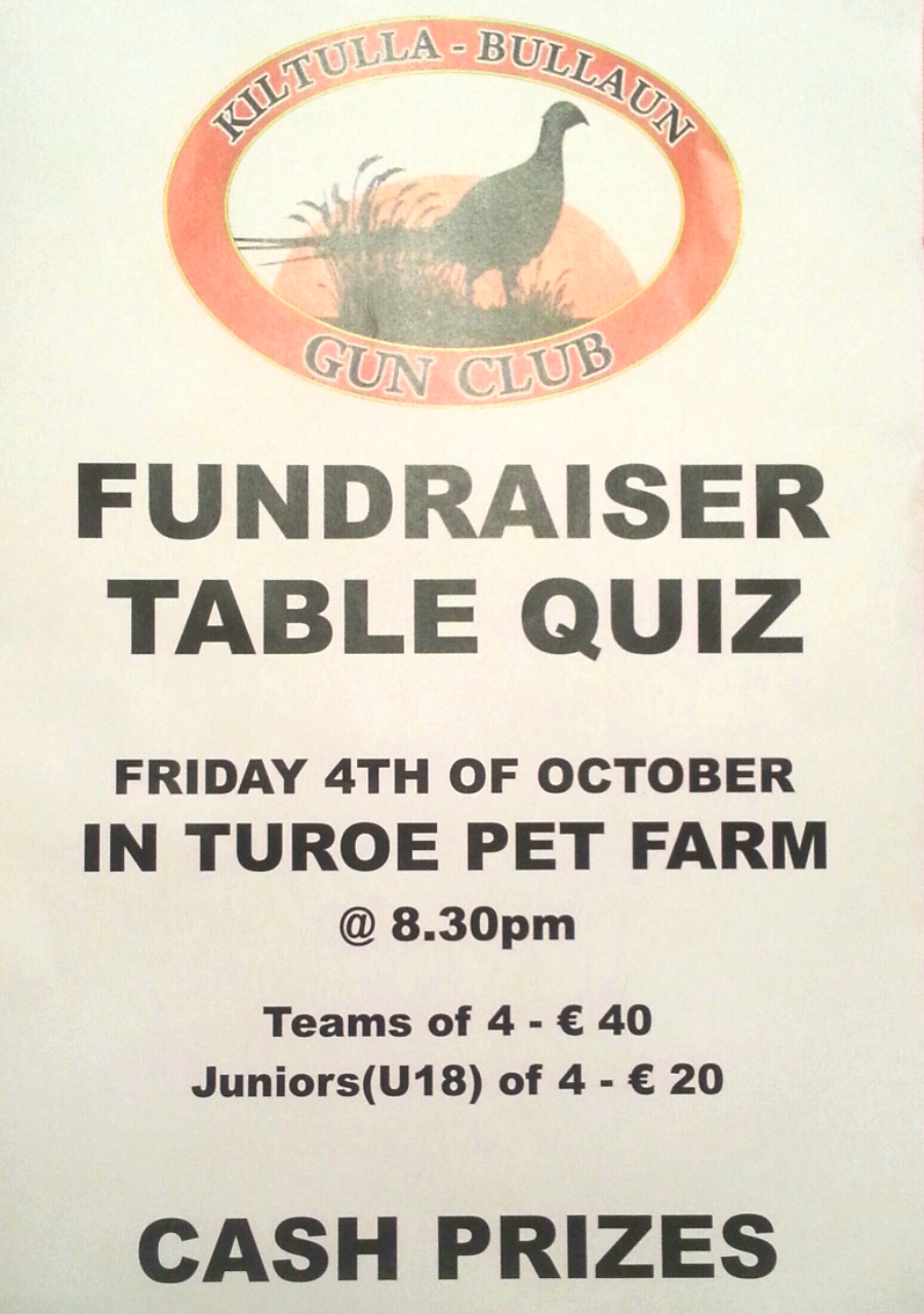 Events, Fundraising Kiltulla Bullaun Gun Club Table Quiz Posted by kiltullaghkillimordaly on October 3, 2013October 3, 2013 Share this: Click to share on X (Opens in new window) X Click to share on Facebook (Opens in new window) Facebook Like Loading... Related