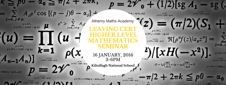Leaving Certificate Higher Level Mathematics Seminar for students sitting their exams in 2016, is scheduled to take place on Saturday, 16th January, 2016, 3-6pm in Kiltullagh National School.