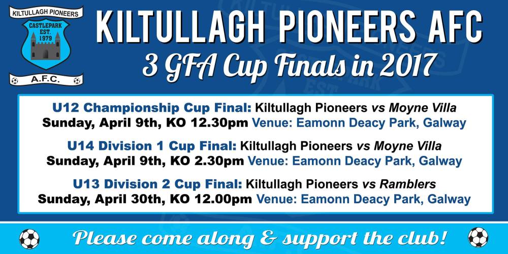 Kiltullagh Pioneers U12 and U14 boys take on Moyne Villa in back to back divisional cup finals. Come and support the lads as they look to finish the season with some well deserved silverware.