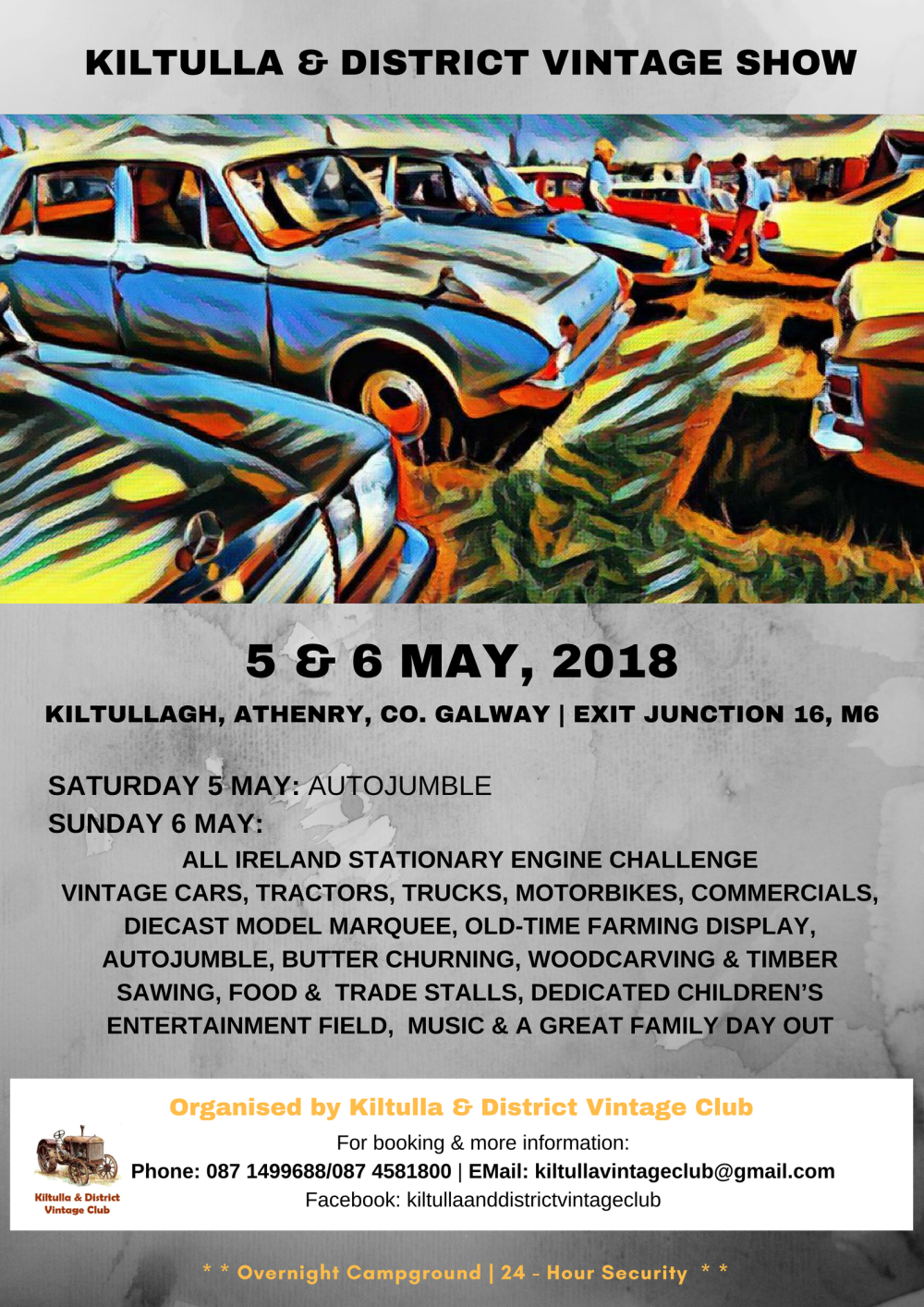 Kiltulla and District Vintage Club 2018 show is scheduled for Saturday 5th and Sunday 6th May, at in Mannions fields at Kiltullagh, Athenry, County Galway. (opposite Duanes Foodstore)