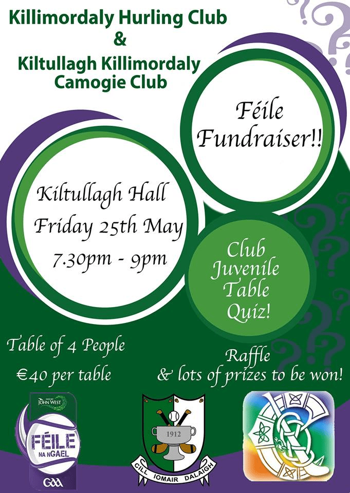 Juvenile Quiz Feile Fundraiser Friday 25 May, at 7:30pm in Killtullagh Hall. Suitable for kids aged 10+. Prizes and raffle on the evening. All support is appreciated.
