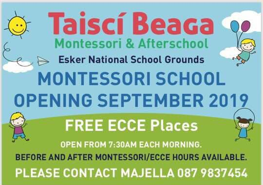 Taiscí Beaga Montessori & Afterschool are also happy to announce they will be opening a BREAKFAST CLUB from 7.30am daily, on the grounds of Esker National School.