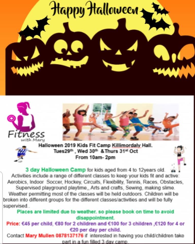 Events Halloween Camp with ‘Fitness with Mary’ Posted by kiltullaghkillimordaly on October 11, 2019 Halloween Camp with ‘Fitness with Mary‘ Contact Mary at 087 813 7176 . Share this: Click to share on X (Opens in new window) X Click to share on Facebook (Opens in new window) Facebook Like Loading... Related