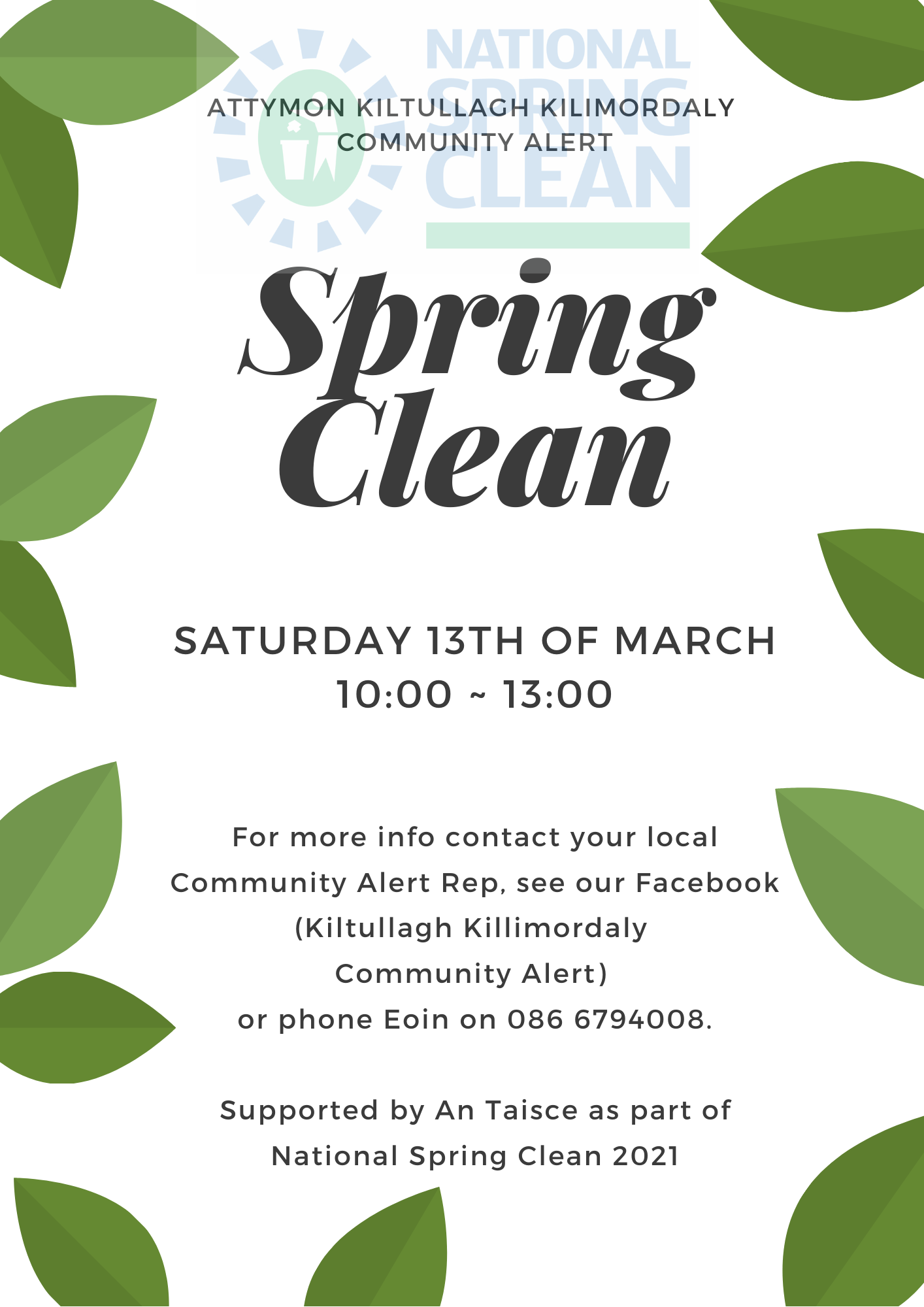 Kiltullagh Killimordaly Community Alert will be hosting a Spring Clean event on Saturday 13th of March from 10:00 until 13:00. Due to Covid-19 restrictions we will stay within our local zones.