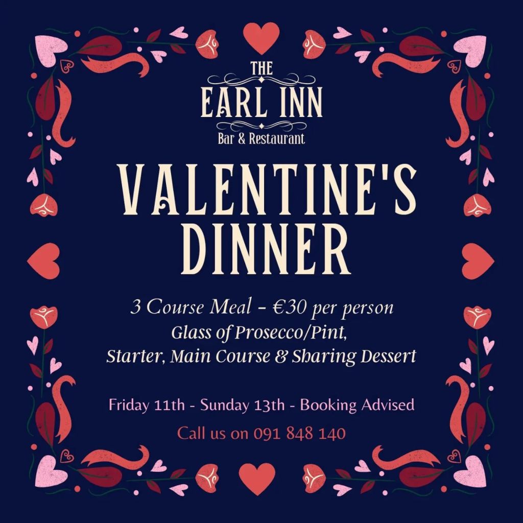 Three course meal available this Valentines at The Earl Inn, Raford. Limited space left – Call 091 848 140. The Earl Inn have live music, delicious food and drinks and they will even drop you home.