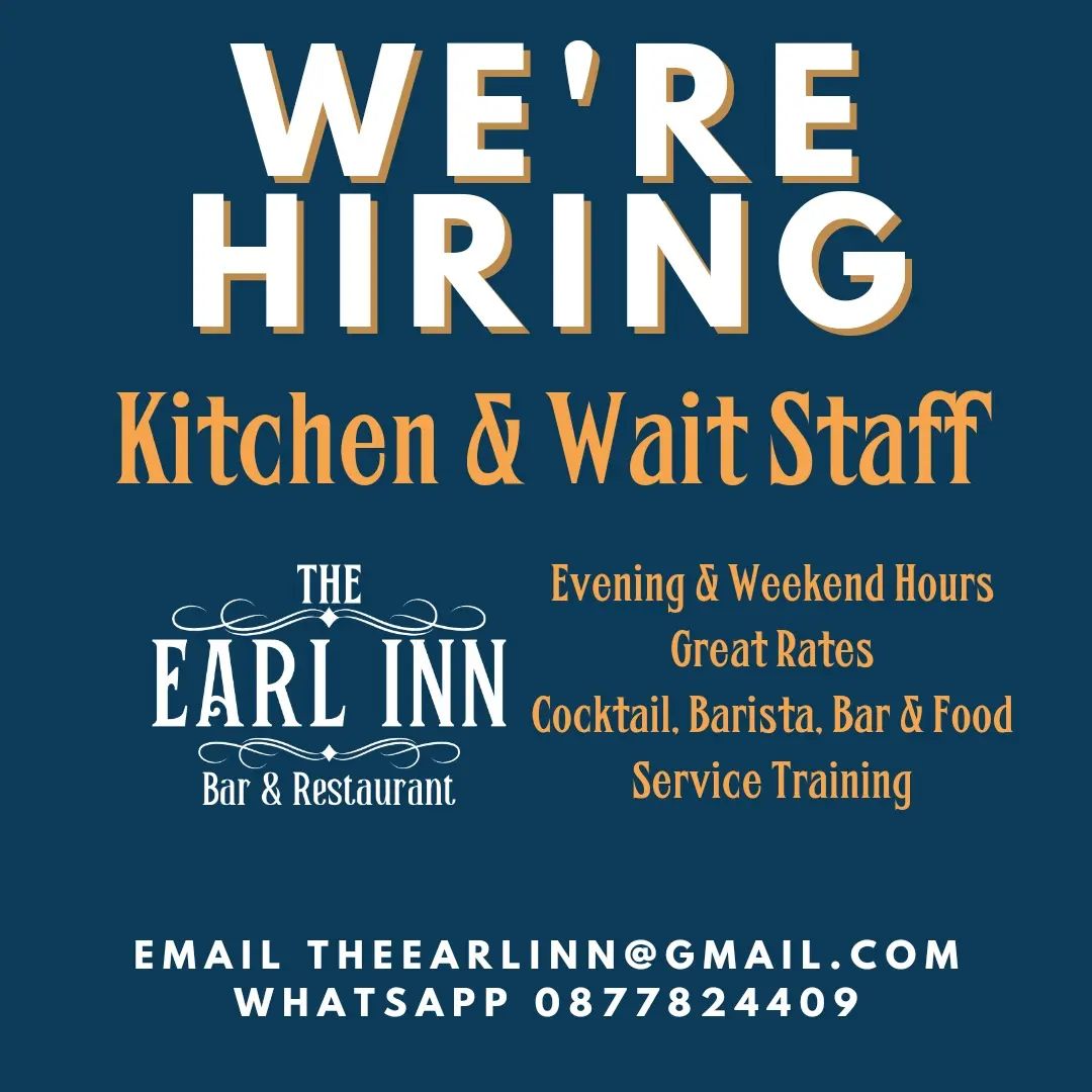 The Earl Inn, Raford, have a number of openings for experienced kitchen assistants and waiting staff. Email theearlinn@gmail.com or WhatsApp 087 7824409.