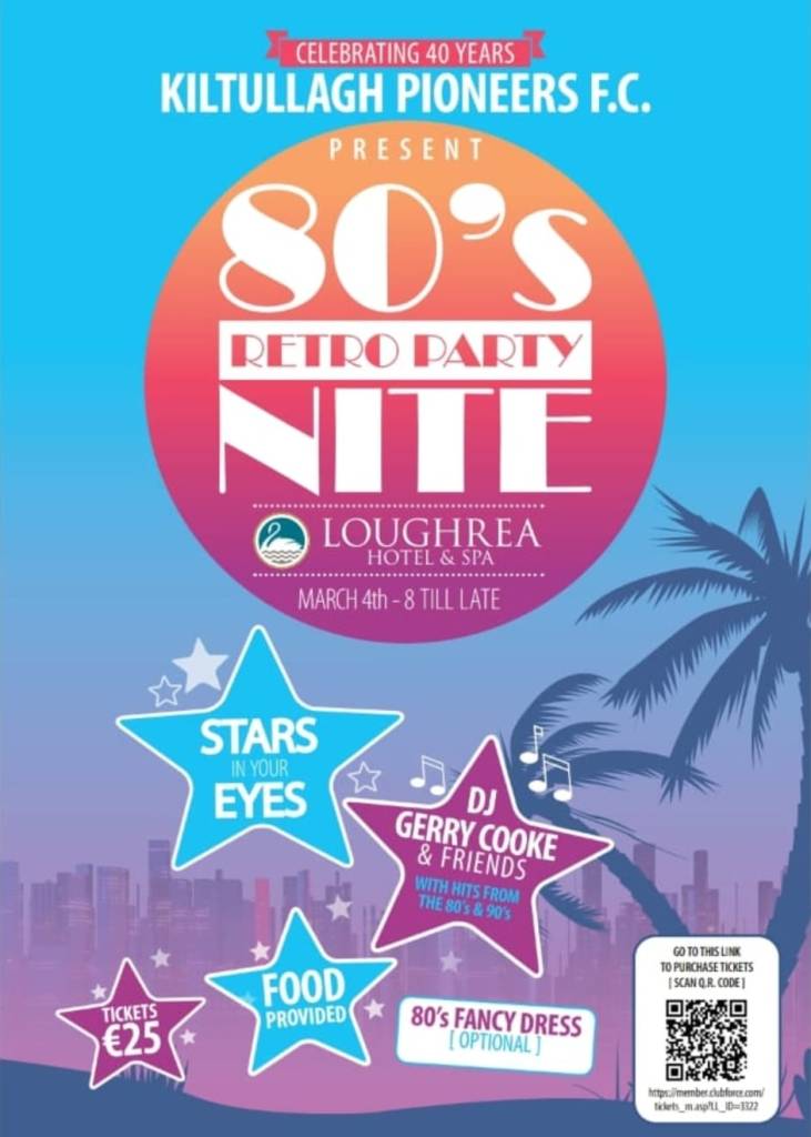 80s RETRO PARTY NITE SATURDAY, 4 March at Lough Rea Hotel & Spa is a fundraiser for Kiltullagh Pioneers FC.